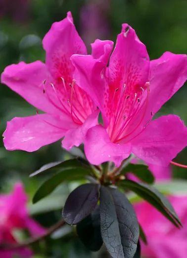 半常绿灌木。伞形花序1-3朵,花冠宽漏斗形,紫色,最上部1枚裂片有深紫色斑。深圳地区常见的还有白花杜鹃和粉花杜鹃。